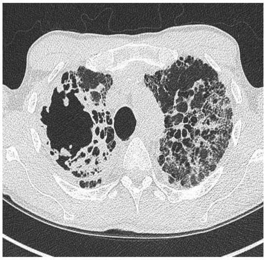 Radiological macroscopic morphology can be classified into three main types: the commonest is cylindrical bronchiectasis—where bronchi have a uniform calibre and do not taper (associated with the tram track and signet ring sign), varicose bronchiectasis—where bronchi are dilated and constricted in an irregular pattern, and cystic bronchiectasis—the most severe form where bronchi dilate to look cyst-like (Figure 2). The relative distribution of radiological bronchiectatic changes have been reported as: cylindrical 47%, Varicose 9.9%, cystic 45% and multiple types 24.3% []. Radiology can be highly influenced by underlying aetiology; CF-related bronchiectasis is often multilobar with an upper lobe predominance, ABPA tends to be seen in the upper and middle lobes, while bronchiectasis associated with connective tissue disease tends to be seen in the lower lobes. Recurrent infection and aspiration are associated with lower lobe disease, with the latter having a predilection for the right lower lobe [].
