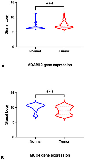 3.6. Quantitative Assessment of the Expression of ADAM12 and MUC4 Isoforms