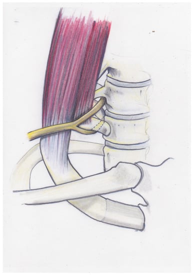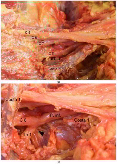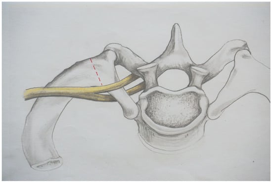 Resection with no more than 1 or 2 cm of rib remaining at the proximal stump has been considered adequate [,,]; one exception is the procedure reported by Illig, who describes the removal of the first rib, which includes the articular section of the vertebrocostal joint []. As we will explain in this study, the proximal 1–2 cm of the first rib seems to be a critical area for the pathogenesis of the TOS. The neuroforamen of the root Th1 (Thoracal 1) lies dorsally below the first rib. Therefore, for a distance of approximately 1 cm, the Th1 root runs adjacent to the caudal aspect of the first rib before it unites with the root C8 (Cervical 8) at the anterior margin to form the inferior trunk. Figure 2a shows the situs from a cranial to caudal viewing angle.