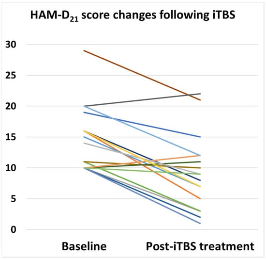 Longitudinal changes in HAM-D 21-item score following iTBS treatment for depressive symptoms in patients with ASD. Each color represents the score change for each patient.
