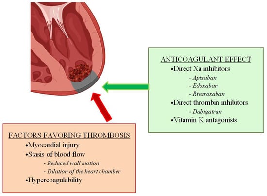 In the ventricle, thrombus formation reflects the presence of factors that represent Virchow’s triad, namely local myocardial injury, stasis of blood flow due to reduced wall motion and dilation of the heart chamber, and hypercoagulability (Figure 1). However, the contribution of endothelial dysfunction, inflammation, fibrosis, and stasis to thrombus formation in the LV can undergo variations related to the etiological substrate, and these differences may influence the response to the anticoagulant treatment []. Moreover, the anticoagulants may be part of dual or triple antithrombotic therapy and the antithrombotic effect could be potentiated by the summative effect of the drugs. This could be reflected in the speed and rates of thrombus resolution, but in the bleeding risk as well.