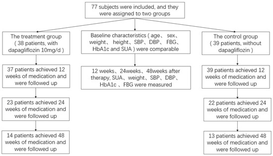 All measurements of physical examinations and blood and urine samples were collected at baseline in all subjects in these two groups and repeated after 12, 24, and 48 weeks of treatment. The study flow chart is shown in Figure 1. Medical records were accessed for baseline and each clinic follow-up, including weight, height, SBP, and DBP. Parameters such as FBG, HbA1c, and SUA levels were also recorded. Body mass index (BMI) was calculated as weight (kg) divided by the square of the height in meters (m2).