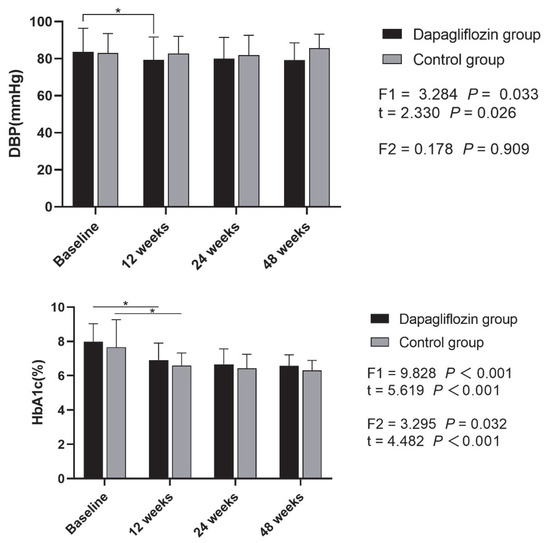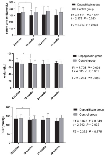 Changes of serum uric acid, weight, SBP, DBP, and HbA1c in dapagliflozin group and control group before and after treatment. F1, one-way repeated measures ANOVA in dapagliflozin group; F2, one-way repeated measures ANOVA in control group. * p < 0.05.
