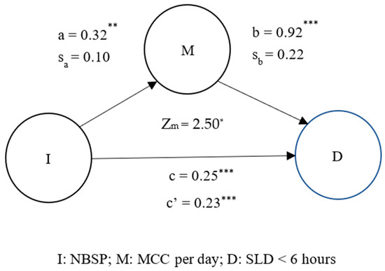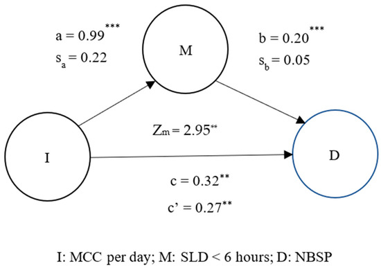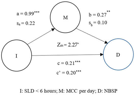 Mediation effect of MCC per day on SLD < 6 h and NBSP. * p < 0.05; ** p < 0.01; *** p < 0.0001; M, mediation factor; I, independent variable; D, dependent variable.