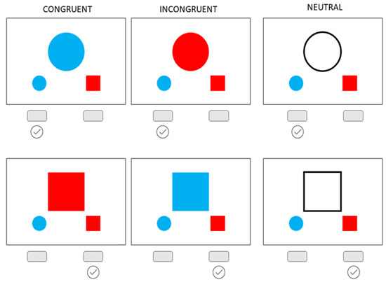 The Bivalent Shape Task [22] is similar to different cognitive inhibition tasks assessing attentional interference (e.g., Stroop test [16], Simon interference task [17], and Eriksen’s flanker task [18]) but allows for a non-linguistic assessment of inhibitory control). In this task, participants are presented with a simple visual stimuli set up—one central shape (either circle or square) and two smaller shapes below (one circle and one square). In each trial, the participant is asked to determine if a shape presented at the center of the screen is a circle or a square and to simply press the left button if it is a circle and the right button if it is a square, as indicated by a visual response cue (i.e., smaller shapes) below each central shape (Figure 1). However, these response cues are colored in either red or blue, and the central shape is also presented either in red, blue, or only as a black outline. Therefore, there are three types of trials: (a) congruent condition—in which the color of the central shape matches the response cue color; (b) neutral condition—when the shape is presented only as an outline, i.e., a black line with no color fill; and (c) incongruent condition—in which the color of the central shape does not match the correct response cue but matches the incorrect one. The testing was performed using the Psychology Experiment Building Language [23].