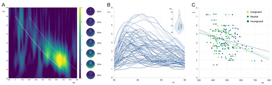 To the best of our knowledge, this is the first attempt to relate individual measures of the ability to generate gamma-range activity to individual performance on cognitive inhibition tasks. We recorded responses to auditory stimulation covering the frequency range within 30–60 Hz in a manner that was carried out in [24]. This allowed us to estimate IGFs as the stimulation frequencies producing the strongest and most synchronized responses [19] which, in accordance with previous reports [19,20], were around 40–42 Hz on the group level and in the 32–59 Hz range on the individual level. Responses showed topographical distribution with a clear fronto-central activation (Figure 2), thus being in accordance with classical single-frequency ASSRs [15]. To enable comparison with the existing 40 Hz ASSR literature, we assessed the phase-locking index and event-related spectral perturbation at 40 Hz (40Hz_EFR). To evaluate the prospect of an individualized approach, the same measures were extracted at IGF (IGFEFR), defined as the frequency of the maximal response.