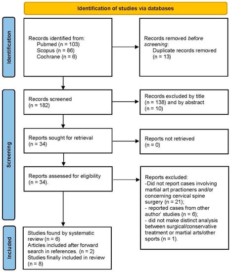 A total of 195 articles were found after a database search. Thirteen articles were removed after the exclusion of duplicate records, 148 articles were excluded by title and abstract, and 34 articles underwent a full-text analysis. Two more articles were found by analysis of references. At the end of the process, we selected 8 articles (see Figure 1), including 23 athletes who practice wrestling (n = 16), kickboxing (n = 1), sumo (n = 1) or other unspecified martial arts (n = 5) (see Table 1) [,,,,,,,]. We added the case of a judoka who underwent anterior cervical discectomy and fusion (ACDF) at our Hospital.