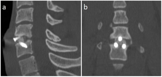 CT scan sagittal (a) and coronal (b) images of the cervical spine 3 months after surgery, showing the formation of bone bridges as a sign of initial arthrodesis.