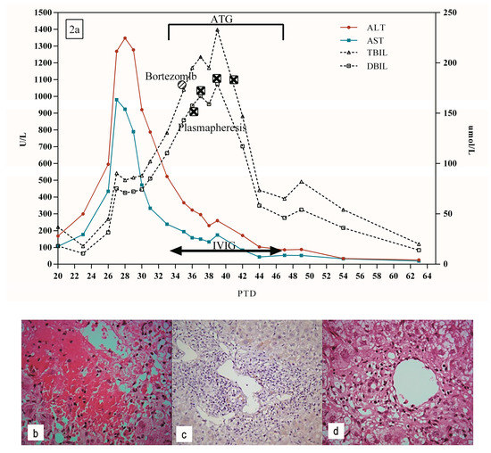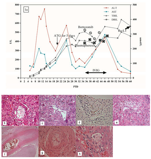 A 48-year-old woman with end-stage liver disease caused by ALD underwent piggyback LT in April 2014. One week after the transplant, the ALT (153 U/L) and AST (118 U/L) began to increase, while bilirubin levels were normal (Figure 1a). The Doppler ultrasound of the liver was normal, and the biopsy revealed few lymphocytes infiltrates in the portal area, slight hepatocyte swelling, and necrosis, and slight cholestasis of capillary bile ducts around the central vein compatible with Banff Schema (Figure 1b), so mild ischemia-reperfusion injury or drug-induced liver injury was considered. To avoid hepatotoxicity of the drugs of tacrolimus, the patient was treated with ATG therapy for 5 days (Figure 1a), during which tacrolimus was discontinued. After treatment, the ALT, AST, and bilirubin levels remained elevated.