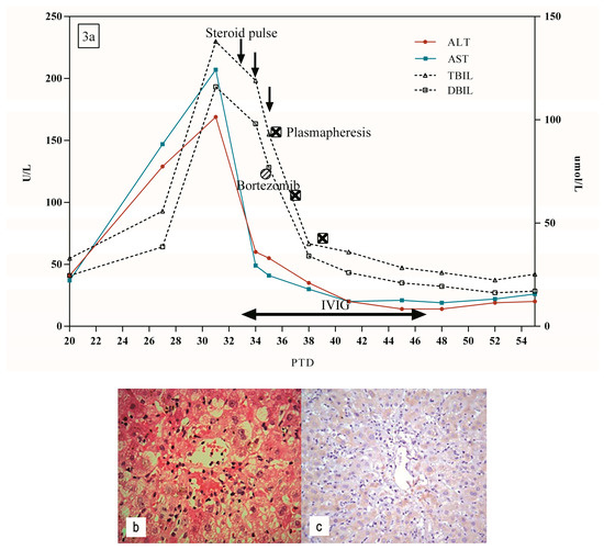 In the next half month, the patient was given plasmapheresis, combined with rituximab (100 mg, twice with an interval of 5 days), ATG, and IVIG treatment (Figure 4a). During this period, she had continued elevation of her TBIL and DBIL, which peaked at 505.2 µmol/L and 421.2 µmol/L on PTD 49, respectively. Repeat antibody testing showed DSA to DQ7 (7178.65 MFI) and DQ9 (6573.781 MFI) were decreased on PTD 54. On PTD 65, the bilirubin levels began to decrease. Eventually, the ALT, AST, TBIL, and DBIL returned to normal on PTD 126.