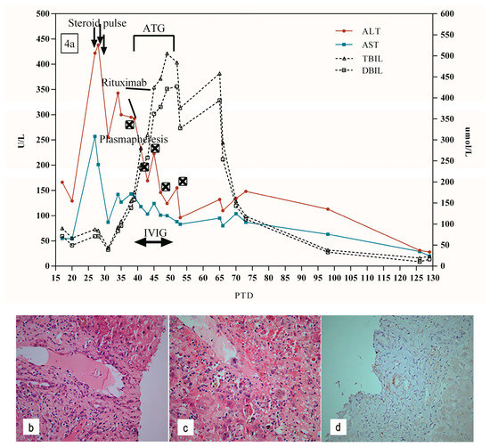 A 51-year-old woman with end-stage liver disease caused by ALD underwent orthotopic LT in December 2019. The patient was admitted on PTD 27 due to an elevated AST (257 U/L) and ALT (422 U/L) (Figure 4a). Doppler ultrasound and MRCP were normal. A liver biopsy showed mild lymphocytic infiltrate in the portal tract and scattered hepatocyte necrosis (Figure 4b), so the TCMR was considered. The patient was treated with a steroid pulse (500 mg of methylprednisolone for 3 days). After treatment, the ALT and AST began to decrease, but bilirubin continued to rise.