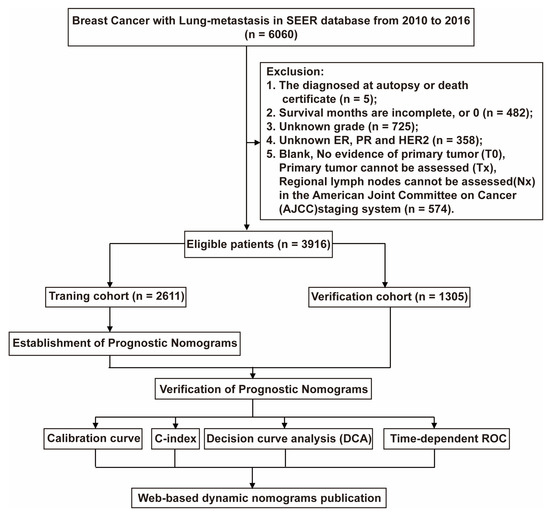 The trial population included adult female breast cancer patients diagnosed with lung metastases from 2010 to 2016. We included the patients’ race, age, marital status, detailed tumor node metastasis (TNM) staging, and whether they had undergone primary site radical resection, chemotherapy, ER, PR, HER2 receptor status, bone metastasis, brain metastasis, or liver metastasis. We excluded patients who had no pathological results and no complete information. Finally, 3916 patients were included in our study, and the selection flow chart is shown in Figure 1. This type of retrospective research does not require an ethics committee review.