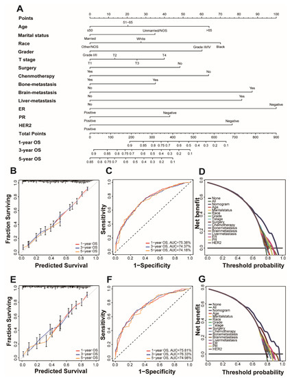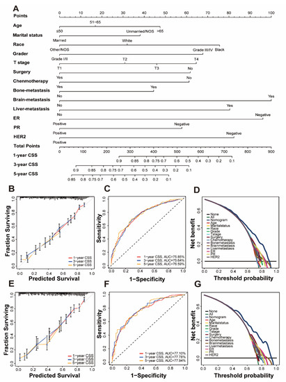 DCA can compare nomograms and other factors to help clinicians make beneficial decisions. Figure 2D,G shows the DCA curves of OS for nomogram and other clinical factors, and Figure 3D,G represents CSS. Compared with all other clinical factors, the DCA of the nomogram showed a superior net benefit, suggesting an excellent clinical application of the nomogram in this study.