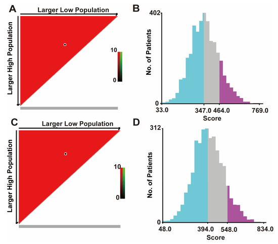 X-tile software (version 3.6.1; Yale University, New Haven, CT, USA) was used to calculate the cut-off value by adding the scores associated with each variable to obtain the total score for patients with BCLM. The cut-off values for OS are 347 and 464, and the cut-off values for CSS are 394 and 548 (Figure 4A,B). Therefore, BCLM patients are classified as high-risk (score > 464), medium-risk (347 < score ≤ 464), and low-risk (score ≤ 347) for OS. In addition, BCLM patients were classified as high-risk (score > 548), medium-risk (394 < score ≤ 548), and low-risk (score ≤ 394) for CSS (Figure 4C,D).