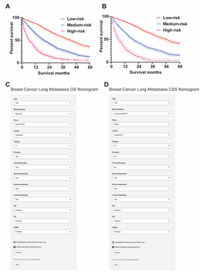 The following are available online at https://www.mdpi.com/article/10.3390/jpm13010043/s1, File: Web-based dynamic nomograms for predicting overall survival and cancer-specific survival in breast cancer patients with lung metastases.