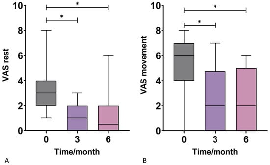 Box-plots show the distribution of visual analog scale (VAS) scores for pain in rest (A) and movement (B) at baseline and at 3 and 6 months after the application of autologous conditioned adipose tissue and leukocyte-poor platelet-rich plasma. Statistically significant VAS improvement in response to therapy was observed at 3 and 6 months at both rest and during movement. *—p < 0.05 (Wilcoxon test).