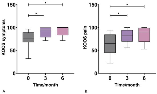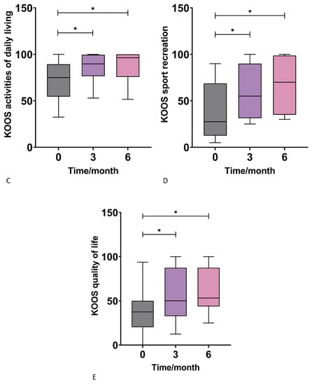 Box-plots show the distribution of Knee Injury and Osteoarthritis Outcome Scores (KOOS) subscores for symptoms (A), pain (B), activities of daily living (C), sport and recreation function (D), and quality of life (E) at baseline and at 3 and 6 months after application of autologous conditioned adipose tissue and leukocyte-poor platelet-rich plasma. There was a significant improvement in all subscores at 3 and 6 months after the therapeutic intervention when compared to the baseline. *—p < 0.05 (Wilcoxon test).