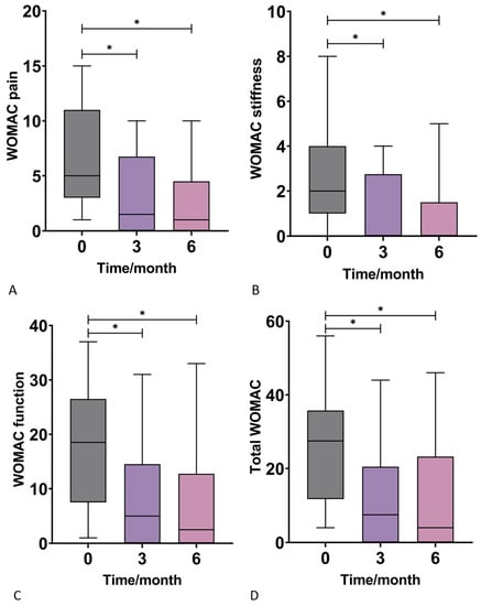 Box-plots show the distribution of Western Ontario and McMaster Universities Osteoarthritis Index (WOMAC) subscores for pain (A), stiffness (B), function (C), and the total score (D) at baseline and at 3 and 6 months after application of autologous conditioned adipose tissue and leukocyte-poor platelet-rich plasma. There was a significant improvement in all subscores 3 and 6 months after the therapeutic intervention compared to the baseline. *—p < 0.05 (Wilcoxon test).