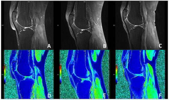 Sagittal MRI magnetic resonance imaging (MRI) slices through the center of the knee accessing the patellofemoral joint osteoarthritic changes using fat-suppressed proton-density-weighted turbo spin-echo method at baseline (A), 3 months (B), and 6 months (C) follow-ups with corresponding delayed gadolinium-enhanced MRI of the cartilage (dGEMRIC) images (D–F). No changes were seen when dGEMRIC indices were calculated.
