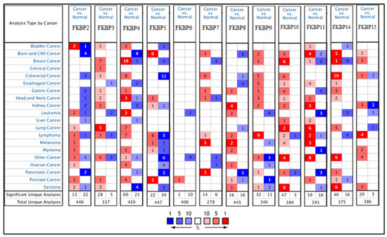 The Oncomine platform (http://www.oncomine.org/, accessed on 22 November 2021) is an online cancer microarray bioinformatics database established to display transcriptional levels of target cancer and normal specimens from 715 datasets [42,43,44]. In this research, we analyzed individual mRNA expression levels of FKBP family members in various types of cancer via Oncomine with the setting of p < 0.01, fold change of 1.5, and gene rank in the top 10%.