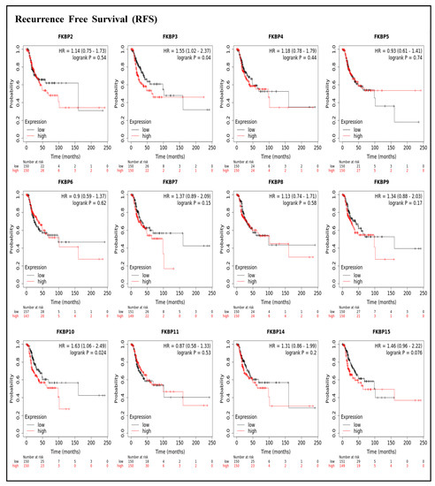 To assess associations between distinct transcriptional levels of FKBP family members and survival rates of LUAD, we used the KM plotter database, and preferentially analyzed OS (Figure 2). Outcomes revealed that five members of the FKBP gene family had correlations with poor prognoses among LUAD patients in the OS analysis including FKBP3 (p = 0.0034; hazard ratio (HR) = 1.55), FKBP4 (p = 0.00051; HR = 1.67), FKBP5 (p = 0.013; HR = 1.44), FKBP9 (p = 0.023; HR = 1.4), and FKBP10 (p = 0.041; HR = 1.35). However, transcriptional levels of FKBP2, FKBP6, FKBP7, FKBP8 FKBP11, FKBP14, and FKBP15 were not linked to the OS of LUAD patients. mRNA expressions of FKBP family memberss in relation to RFS were also analyzed (Figure 3). Low transcriptional levels of FKBP3 (p = 0.04; HR = 1.55) and FKBP10 (p = 0.024; HR = 1.63) in LUAD patients were correlated with a longer RFS, while the remaining FKBP family members were not related to RFS in LUAD samples (Supplementary Table S2).