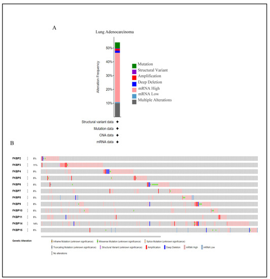 Mutations in FKBP family numbers had large impacts on FK506 binding and its enzymatic functions [71]. Thus, we conducted a visual analysis to gain insights into genetic alterations of the FKBP gene family alongside the cBioPortal bioinformatics tool from TCGA. Results revealed that FKBP family members were altered in 272 instances among 503 LUAD patients, and these alterations included mutations, structural variants, amplifications, deep deletions, mRNA high, mRNA low, and multiple alterations based on the dataset (Figure 4A). The rate of genetic alterations in FKBP family members ranged from 5% to 14% (FKBP2, FKBP5, FKBP8, and FKBP11: 5%; FKBP6, FKBP7, FKBP10, and FKBP15: 6%; FKBP9: 8%; FKBP4: 9%; FKBP3: 11%; and FKBP14: 14%) (Figure 4B).