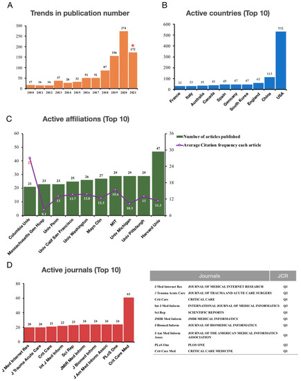 The publication trends, active countries, journals, and affiliations in the research of AI in CCM. (A). Number of published papers, *, 2021 number is partial to Jun 2021. (B). Active countries. (C). Active affiliations. (D). Active journals.