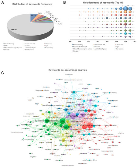 Regarding keywords, 2038 authors provided keywords that appeared in 937 articles with 4111 frequencies. The top ten keywords accounted for 25% of the total frequency. They are “machine learning” (256), “intensive care unit” (136), “critical care” (126), “EHRs” (94), “prediction” (85), “sepsis” (85), “clinical decision support systems” (70), “artificial intelligence” (62), “deep learning” (58), and “mortality” (55; Figure 3A). The variation trends of these high-frequency keywords are shown in Figure 3B. Studies with deep learning as a keyword began to appear in 2017. Through keyword co-occurrence analysis, this study found that the mortality of sepsis may be representative of the AI applied in the field of CCM (Figure 3C).