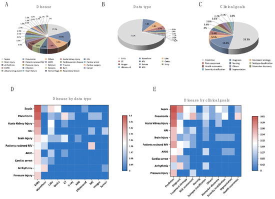 Features of AI in adult CCM. (A). Type of diseases. (Sepsis includes sepsis and septic shock; pneumonia includes community-acquired pneumonia and COVID-19 pneumonia, but does not include hospital-acquired pneumonia and ventilator-acquired pneumonia; acute kidney injury includes acute kidney injury and acute renal failure; HAI includes ventilator-acquired pneumonia, catheter-associated infection and other hospital-acquired infection) (B). Data type. Where studies had more than one data types, all were recorded. (Waveform data includes ECG, EEG, arterial pulse waveforms, and other waveform data; Images data includes endoscopy and facial images.) (C). Clinical goals. (Prediction includes prediction of disease onset/occurrence, progression, and prognosis; segmentation includes spatial segmentation by radiographic features) (D). Disease by data type. (E). Disease by clinical goals. HAI = hospital-acquired infection; MV = mechanical ventilation; ARDS = acute respiratory distress syndrome; COPD = chronic obstructive pulmonary disease; EHR = electronic health record; CT = computed tomography; MRI = magnetic resonance imaging; ECG = electrocardiogram; EEG = electroencephalogram.