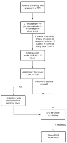 It is widely recognized that time is critical in the treatment of AMI. Therefore, the restoration of blood supply to the bowel is the first priority in these patients in order to avoid the occurrence of irreversible necrosis of the bowel wall. Nevertheless, the results of delayed diagnosis or treatment in predicting mortality after AMI are controversial in the literature [,], and current data suggest that ischemic changes are reversible in the first 6 h, although this is in contrast to ischemic stroke. Furthermore, current guidelines do not provide precise information on the correct timing for revascularization. In our cohort, a mean time between the onset of symptoms and revascularization of 222 min (=less than 4 h) could be achieved, which lead to improved survival compared to the existing literature. In our cohort, there was a statistically significant difference in terms of patient survival and the time from symptom onset to intervention.