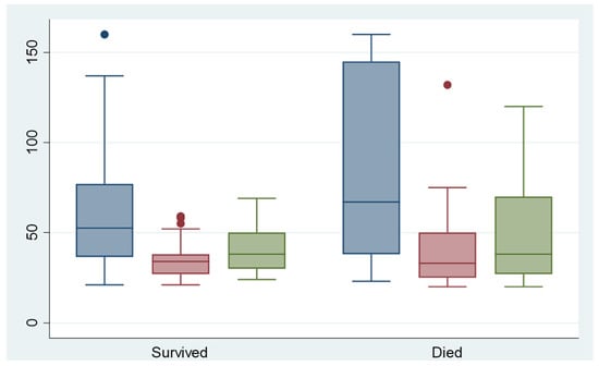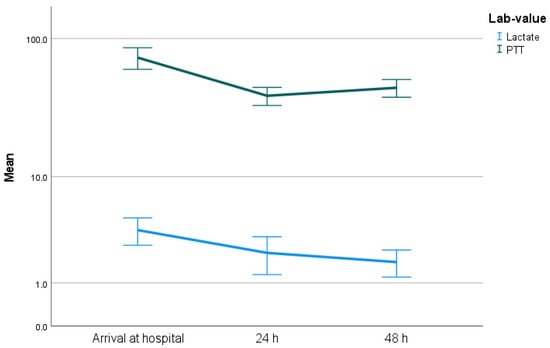 There were statistically significant differences in the laboratory values of lactate and PTT in relation to the arrival value at the hospital or at the onset of symptoms, and also in relation to the course of laboratory values during the first 24 h (Figure 3 and Figure 4). The patients who died within the first 12 months after symptom onset had significantly higher lactate and PTT initially and after 12 h (both p < 0.05).