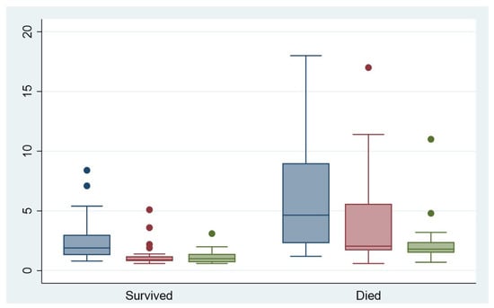 Serum lactate levels on arrival at hospital (blue), after 12 h (red) and after 24 h (green).
