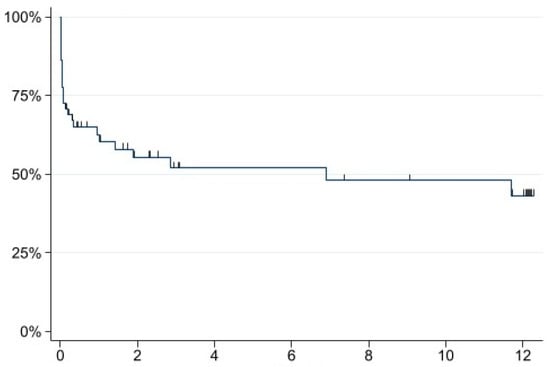 Kaplan–Meier estimates showed a 50% mortality within 6.9 months, whereas 25% mortality was already achieved at 0.67 months (Figure 5).