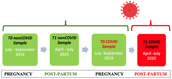 The Non-COVID sample included 68 Italian-fluent adult pregnant women from the general population, screened once during their third trimester of pregnancy (T0) and those who agreed to follow-up were tested again at six months postpartum (T1). Participants with an incomplete EPDS were excluded from the final analysis. Participants were aged 21–46 years (mean = 34.01 years ± 4.68).