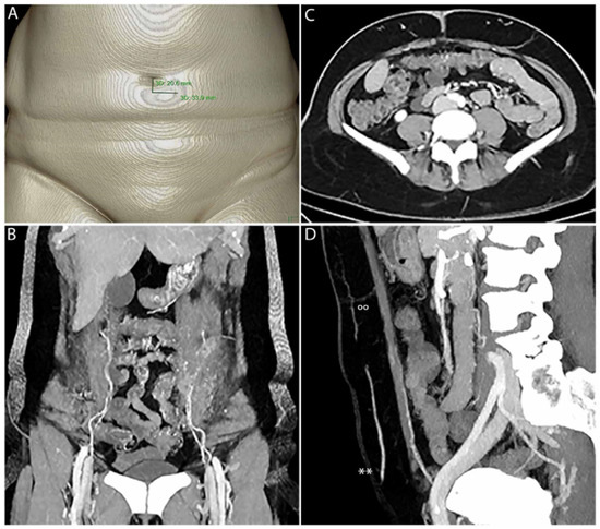 CTA enables fast 3D PM with clear delineation of SP, P, F, M and the IEA. SP must be measured manually in relation to the umbilicus (A). (B) shows PM in 3D. The origin of the IEA, including M with type II branching on the left and type I branching on the right, is clearly visible. In (C), F and P of the perforators on the left and right side are clearly visible. IEA, M, F, P(°°) and SP can be clearly seen within the sagittal view (D), including the superficial epigastric artery (SIEA**).