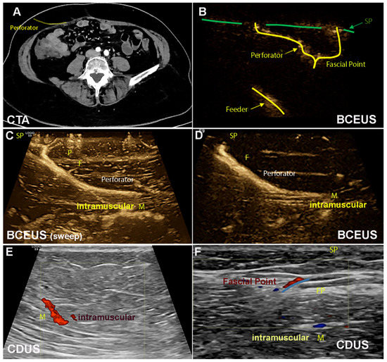 Figure 2. (A) illustrates the DIEP perforator in CTA axial view. (B–F) show PM using BCEUS and CDUS. (B) systematically illustrates the feeder F, P and SP. Only BCEUS is sufficiently able to display P and SP ((C) 3D sweep, (D)). Illustration of the IEA and M is easily feasible via CDUS (E,F). However, P and SP cannot be displayed.
