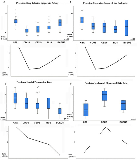 Figure 3. Figure 3 displays the precision of PM, measured as ∆L (mm), corresponding to the difference between preoperative PM and the actual intraoperative situation. (A) shows the precision of DIEA PM for each imaging mode. (B) displays the precision of M, while (C) displays the precision of F for each mode. (D) clearly shows that only CTA and BCEUS were able to reliably display P and SP.