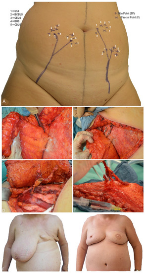 Figure 4. (A) shows preoperative PM. When BCEUS, BUS, CEUS and CDUS were used, landmarks could be directly navigated on the abdomen. (B) illustrates F and P of the respective perforators. In (C), the clamping test is shown. (D) portrays the intramuscular dissection of the perforator vessels down to the origin of the DIEA. (E) shows the harvested fasciocutaneous DIEP flap, including the perforator vessels. (F) shows pre- and postoperative pictures of a patient after breast amputation and consecutive DIEP flap reconstruction, including contralateral breast reduction.