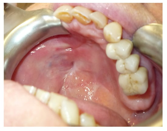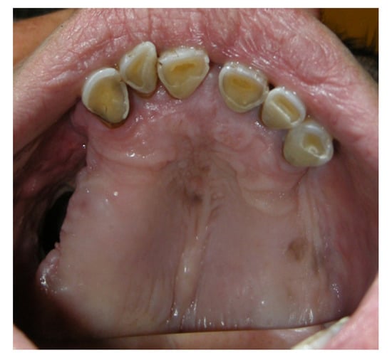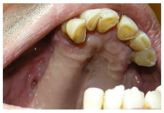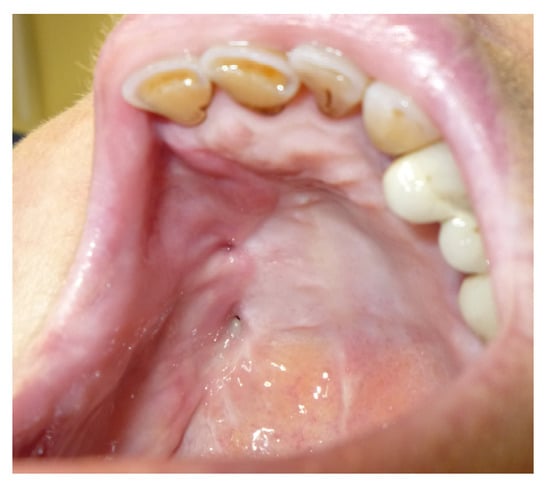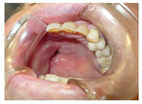 - Brauner, E.; Valentini, V.; De Angelis, F.; Jamshir, S.; Visca, A.; Romeo, U.; Tenore, G.; Pompa, G.; Di Carlo, S. Gingival hyperplasia around dental implants in jaws reconstructed with free vascularized flaps: A case report series. J. Int. Dent. Med. Res. 2018, 11, 1–7. [Google Scholar]