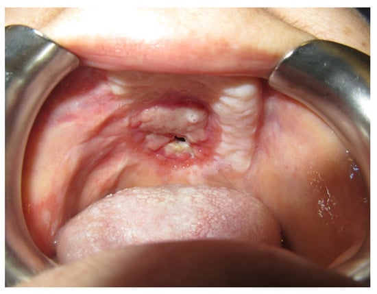 A 19-year-old female patient with a previous palatal carcinoma. The patient was being treated with Metformin for type 2 diabetes. She reported only an allergy to penicillin. She was referred to our department after the removal of a type II palatal fistula carcinoma according to the Pittsburg classification (Figure 8). The patient had all the dental elements of the upper arch, and the basal maxillary bone was not involved, so she belonged to group 1, subgroup B, according to the classification in Table 2.