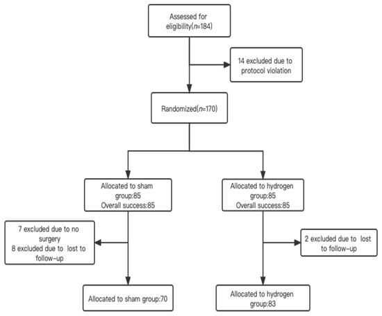 From 10 January 2021 to 30 September 2021, a total of 170 patients meeting the inclusion criteria were enrolled in the study and randomly assigned to either the hydrogen (n = 85) or placebo (n = 85) group (Figure 1). There was no blinding lapse during this study. Ultimately, 153 patients completed the delirium assessment and were included in the final analyses (Figure 1). The final visit of the last randomized patient was on 20 September 2021.
