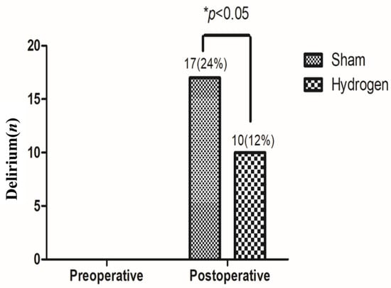 The pathophysiology of delirium is not fully understood, and we cannot explain the condition clearly using a single mechanism. Some studies emphasize the role of inflammation, particularly the effect of inflammatory factors on the blood–brain barrier and the effect of chronic stress on cytokines as well as cortisol. Other research [] emphasizes imbalances in the central neurotransmitter transmission [,]. There is much research focusing on pharmacological agents for the prevention and treatment of delirium, but drugs inevitably have side effects. Hydrogen shows strong anti-oxidant activity and high tissue-transfer ability and can be safely applied to live animals and patients []. Therefore, in this study, prophylactic hydrogen inhalation was innovatively administered to elderly patients to determine whether it could reduce the occurrence of postoperative delirium.