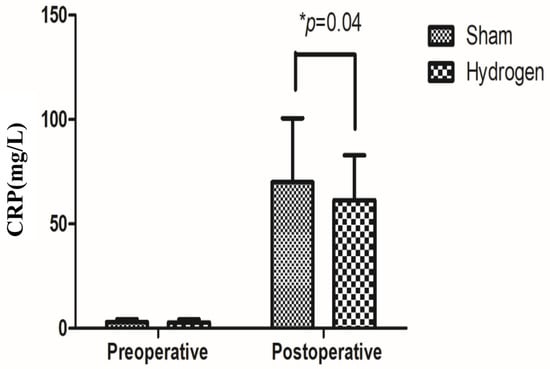 For the additional outcomes, there was no significant difference in sleep quality between the two groups at 1, 3, or 7 days postoperatively, and the sleep quality gradually recovered over 7 days postoperatively (Table 3). The NRS pain scores were higher in the hydrogen group (4.08 ± 1.77) than in the control group (3.54 ± 1.77) on day 1 (p < 0.05); however, the mean difference in NRS pain scores between the groups was small (1 to 1.6). There was no significant difference on day 3 or 7. The pain gradually decreased over 7 days (Table 3). The postoperative CRP level measured 1 day after surgery was significantly lower in the hydrogen group than in the control group (Figure 3).