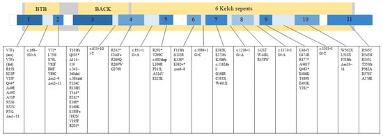 GAN is caused by a mutation in the GAN gene, which encodes a protein called gigaxonin []. Gigaxonin is a part of the ubiquitin-proteasome system and controls autophagosome production []. Specifically, gigaxonin plays an important role in the breakdown of neurofilament (NF) [], where the cellular hallmark of GAN pathology is the formation of its large aggregates [,,]. According to the Leiden Open Variation Database (LOVD) (updated 2022), National Center for Biotechnology Information (NCBI) (updated 2022), and the mutation summary reported by Lescouzères and Bomont, P. (2020), there are 89 variants that lead to manifestation of GAN (Figure 1) [,,,,,,,,,,,,,,,,,,,,,,,,,,,,,].