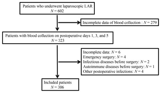 The inclusion criteria were as follows: patients aged >18 years; those with proven pathology of primary rectal cancer; those who had undergone laparoscopic LAR; those with complete clinical and pathological data; those whose blood samples were collected on postoperative days 1, 3, and 5; and those with grades B and C AL. The exclusion criteria were as follows: patients undergoing emergency surgery for perforation, bleeding, or obstruction; those with infectious or autoimmune diseases before surgery; and those with other postoperative infections, including respiratory, urinary tract, or incisional infections.