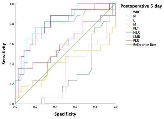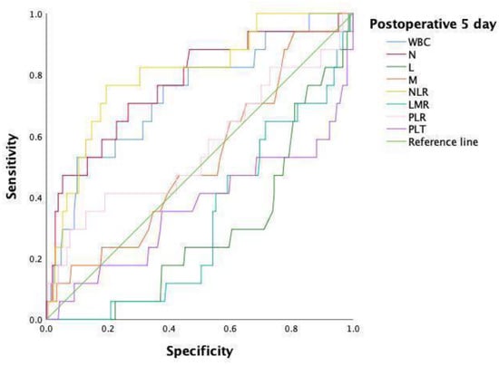 Overall, 61 patients were included in the final analysis. No statistical difference was found between the two matched groups in terms of the clinicopathological data of the patients (Table 4). Furthermore, as shown in Table 5, no statistical significance in the index scores was found at postoperative day 3, representing a large difference compared to the unpaired cohort. Notably, monocyte counts, including those of the unpaired cohort, were also statistically significant (0.44 (0.38–0.53) vs. 0.58 (0.49–0.69), p = 0.008) between the two groups on postoperative day 1. Consistent with previous results on postoperative day 5, the index scores, including WBC (p = 0.003), neutrophils (p = 0.001), lymphocytes (p = 0.015), NLR (p = 0.000), and LMR (p = 0.016), were also found to be statistically significant. Moreover, after the PSM analysis, the ROC curve analysis was performed for further evaluation. As shown in Table 6 and Figure 4, the NLR at a cut-off point of 6.54 on postoperative day 5 was demonstrated to have the optimal AUC (0.818, 95% CI 0.697–0.940, p = 0.000), with the sensitivity and specificity of 76.5% and 79.4%, respectively, followed by the neutrophils (AUC: 0.801, 95% CI 0.666–0.936, p = 0.001) at a cut-off point of 4.84. Moreover, the neutrophil and NLR values were re-analyzed after combination; however, the advantages of these combination were not seen in the analysis (AUC: 0.818, 95% CI 0.697–0.940, p = 0.000) as shown in Table 6 and Figure 5.