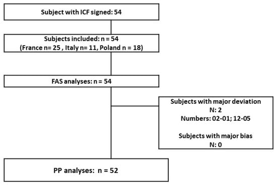 Study population: 54 teenagers and young adults were included (12 to 34 years old; mean age 19.5). Most of the subjects were female (79.63%) and the teenage population accounted for 42.59% of the total. A great majority of the skin phototypes (I to IV) were type II–III. At the baseline, the population was globally homogenous (mild to moderate GEA severity score); only the Polish population had a slightly lower acne severity with 3/18 included subjects having an “almost clear” rating. The disposition of subjects in the different populations presented (Figure 1): 54 subjects are in the FAS population and 52 are in the PP population (2 major protocol deviations in relation with forbidden treatments before inclusion and during the study). There was no associated acne drug treatment at baseline in the included population. The COVID-19 lockdown period was concomitant to the 9- and 12-month follow-ups (visits 5 and 6).