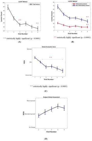 Figure 2. (A) Assessment of acne in cohort population: Acne lesion count. (B) Inflammatory and Non-inflammatory acne lesions (open and closed comedones). Results are expressed as means ± SD; a sustained, statistically significant decrease versus baseline after 6 months (Visit 4) and 12 months (Visit 6) for lesion count (p < 0.0001). (C) Acne assessment using the investigator Global Evaluation of Acne (GEA). Results are expressed as means ± SD. p value < 0.0001 for ∆(Vx-V1) x = 2 to 6. (D) Subject’s Global Assessment (SGA) of acne improvement after the 6- and 12-month follow-ups.