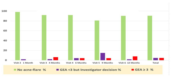 Acne worsening (flare-up), defined as “GEA ≥ 3 and treatment required” was reported in eight subjects during the whole study period. Only six subjects required per protocol antibiotic treatment (3 oral and 3 topical were was prescribed). Only one subject was treated with an oral antibiotic, despite a GEA = 2. The majority of first flare-ups (6/8) occurred during the first six months of the study period (Figure 3).