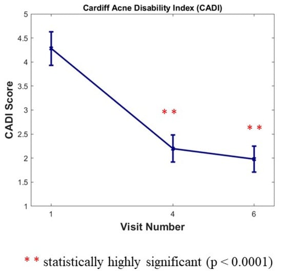 Figure 4. Cardiff Acne Disability Index (CADI) score 0 to 20. Results are expressed as means ± SD; a large statistically significant decrease versus baseline after 6 months (Visit 4) and after 12 months (Visit 6) for this index (p < 0.0001).